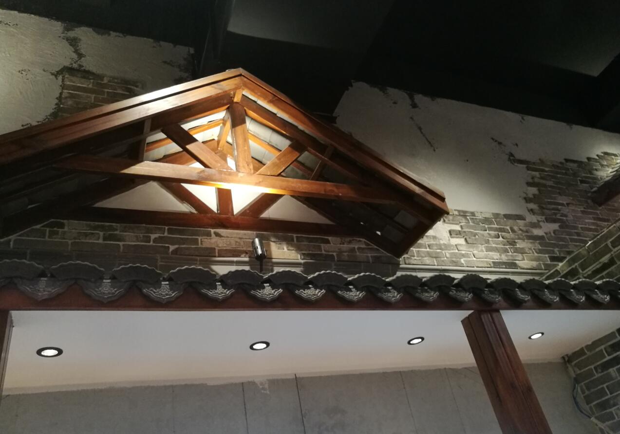 光柏士餐飲照明燈光改造案例---軌道燈照射餐廳的裝飾(木架屋檐裝飾)使用高顯指高飽和度的優質光源,餐廳專用燈具。