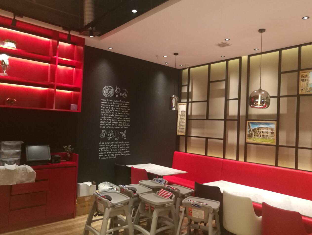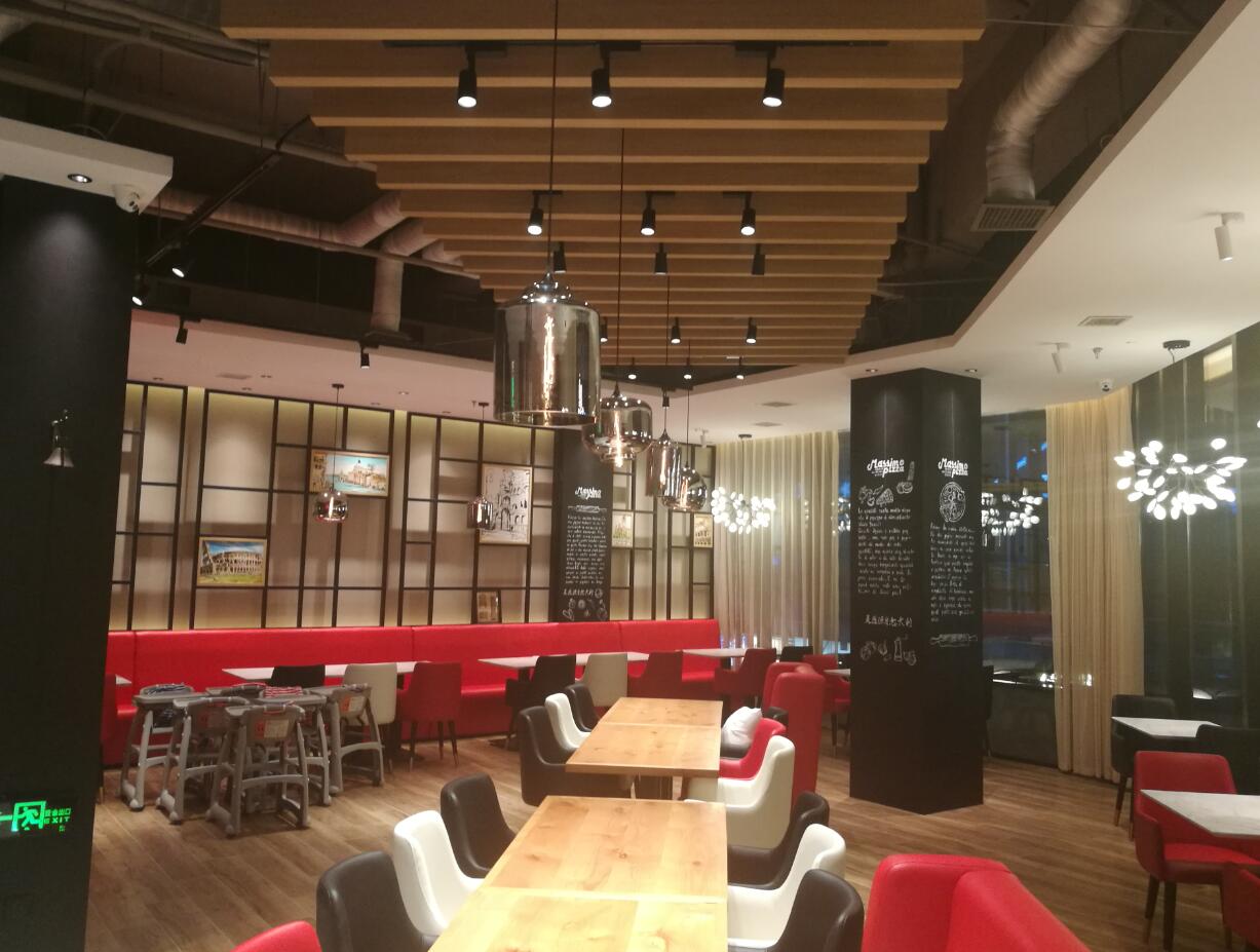 馬西莫餐廳燈(deng)光設計改造現場調節案例--光柏士餐飲照明燈光改造案例--洗墻照明餐飲專用高顯指3000K的嵌入式射燈照射墻面文化,裝飾 ,餐飲專用高顯指2800K的嵌入式射燈照射餐桌