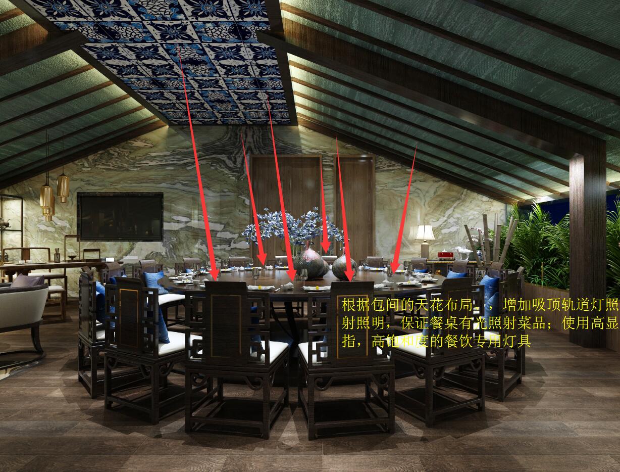 古道村落16人大包間:根據天花布局使用吸頂式的軌道燈照射桌面補光: