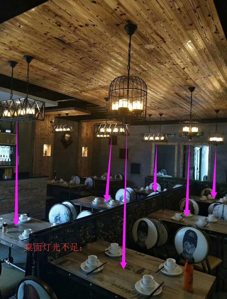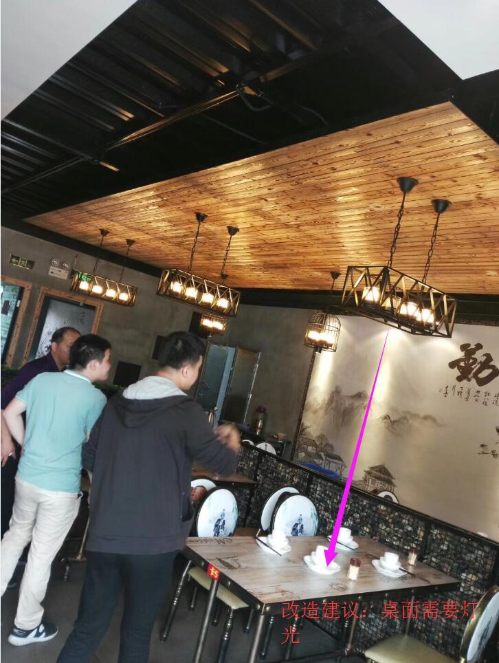 裝飾燈底座下的筒燈;燈光不聚光,燈光無法到桌面;建議更換餐飲照明專用的餐廳燈具,使用高顯指高飽和度的專業餐廳燈光照射桌面;更換裝飾燈底座下的筒燈,或者加吸頂軌道燈補光。