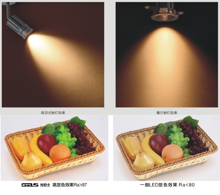 GBS-CY02吸(xi)頂射燈(deng)3000K高顯指(zhi)高飽和度RA97的燈(deng)光(guang)(guang)(高顯指(zhi)餐飲專(zhuan)用光(guang)(guang)源(yuan),適用:照射擺設,綠植,墻面(mian)文化(hua),重點打光(guang)(guang)。)